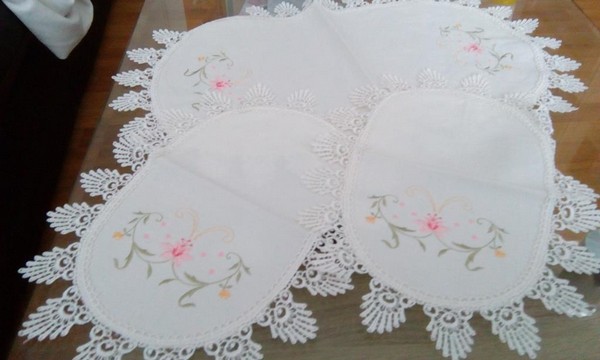 Tris di centrini con fiore rosa bordati a mano il grande misura 50×30